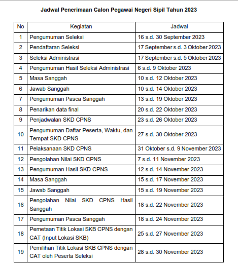| Jadwal Pelaksanaan Seleksi CPNS dan PPPK Tahun 2023 |